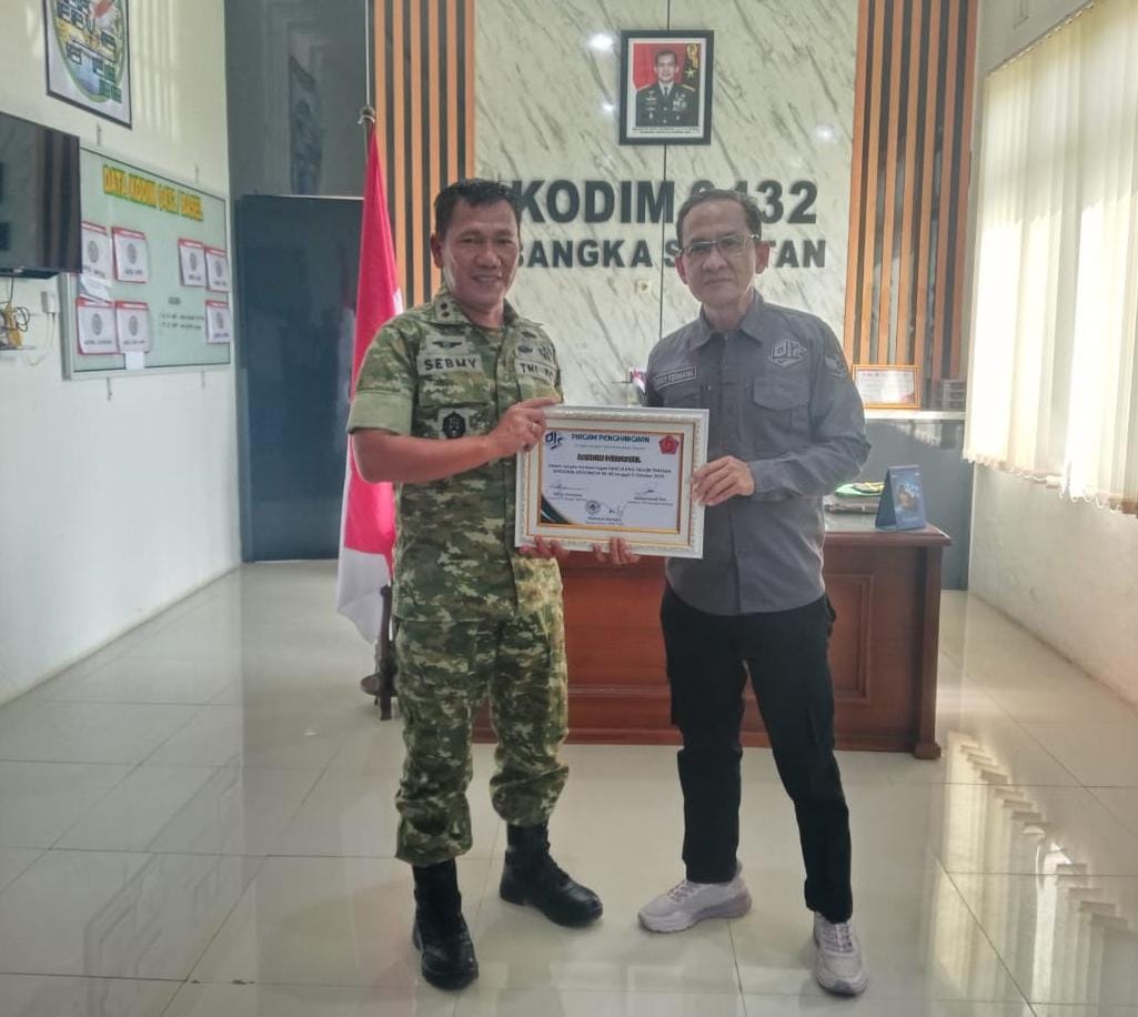 Pertemuan pun ditutup dengan penyerahan *piagam penghargaan dari PJS Babel kepada Kodim 0432/Basel*, diserahkan langsung oleh Ketua DPD PJS Babel, Rikky Fermana, dan diterima dengan penuh kehormatan oleh Letkol Arh Sebmy Setiawan.