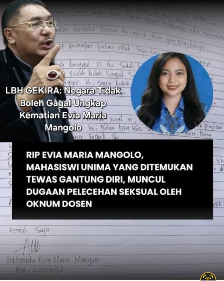 DETIKBABEL.COM, JurnalPatroliNews – Jakarta -Kasus kematian Evia Maria Mangolo, mahasiswi Fakultas Ilmu Pendidikan Psikologi (FIPP) Universitas Negeri Manado (Unima), kini menjadi sorotan tajam bagi penegakan hukum dan perlindungan hak asasi manusia di Sulawesi Utara.