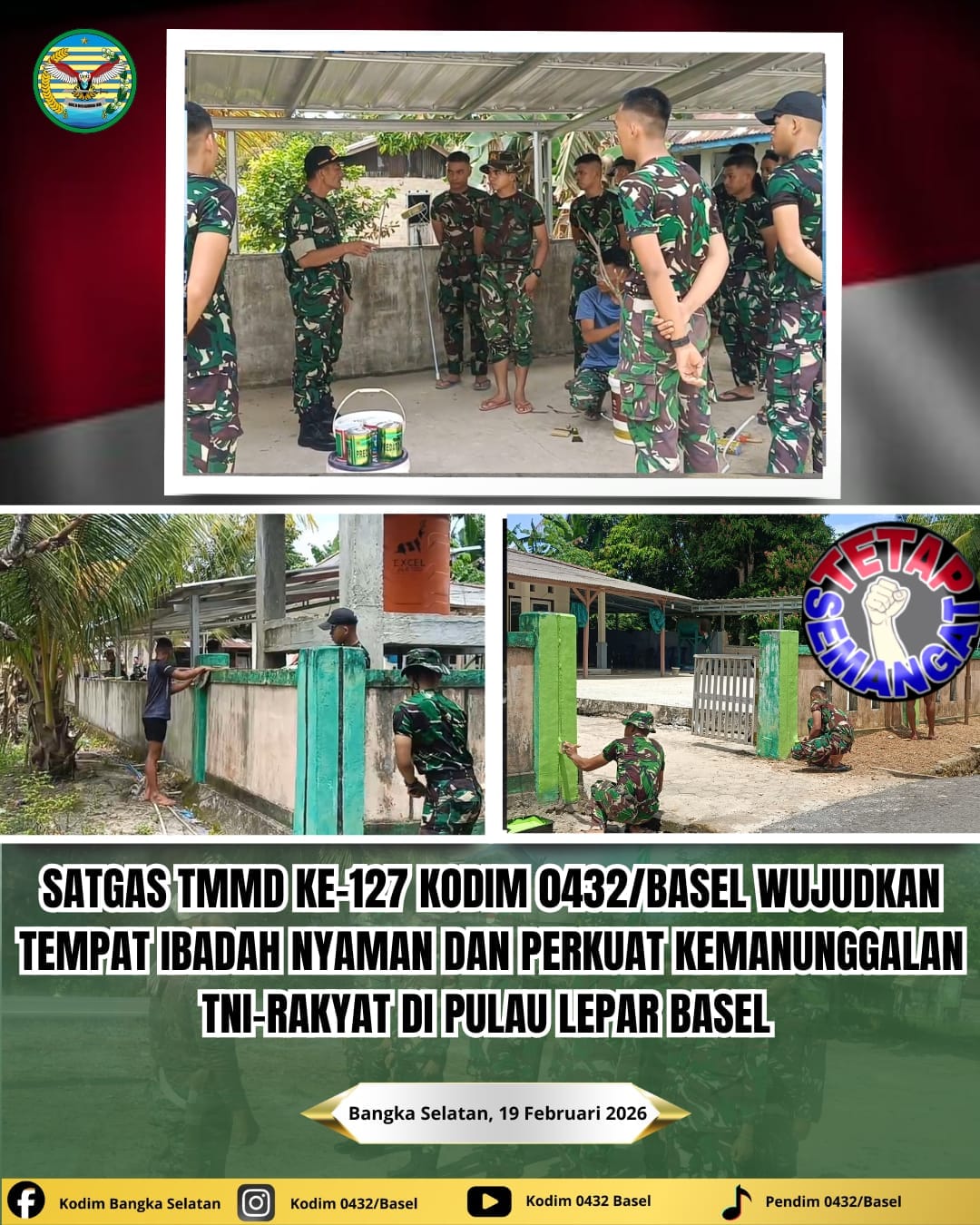 DETIKBABEL.COM, Pulau Lepar Toboali 19 Februari 2026 – Dalam rangka menyambut Bulan Suci Ramadhan dan memperkuat sarana ibadah serta meningkatkan semangat gotong royong, Satuan Tugas (Satgas) TNI Manunggal Membangun Desa (TMMD) Reguler ke- 127 Tahun Anggaran 2026 Kodim 0432/Basel] mempercepat perbaikan (rehab) Mushola Al Munawar yang berlokasi di Desa Penutuk Pulau Lepar Kab Basel.