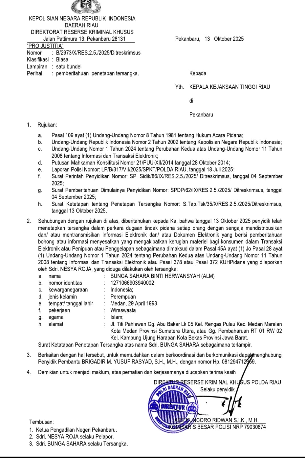Kasus tersebut bermula dari laporan yang diajukan korban pada Juli 2025 dengan Nomor LP/B/317/VII/2025/SPKT/POLDA RIAU. Tersangka diduga melakukan penipuan melalui media elektronik yang mengakibatkan kerugian materiil bagi korban.