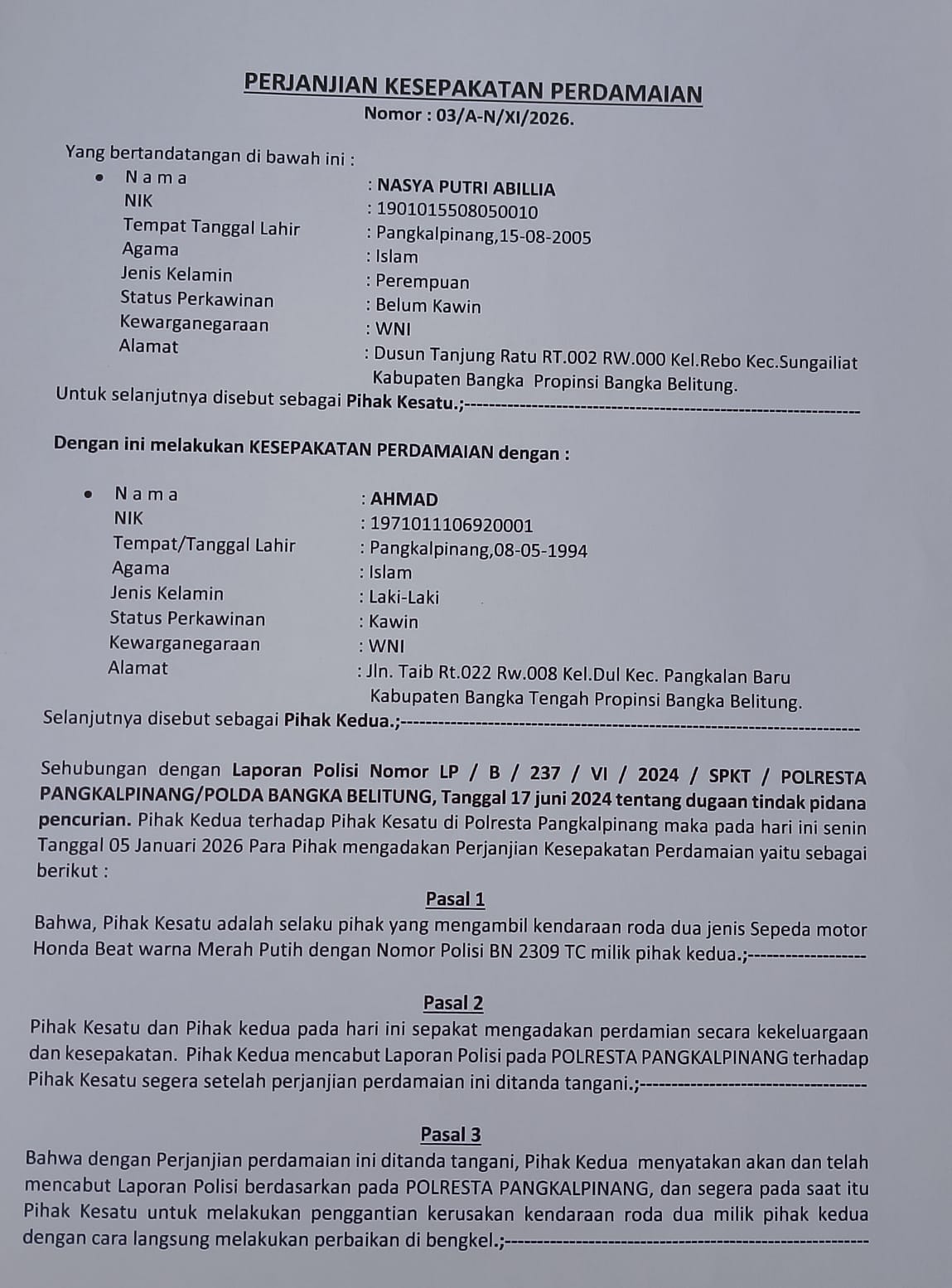 Dalam perjanjian tersebut dijelaskan bahwa objek perkara adalah satu unit sepeda motor Honda Beat milik Ahmad, warga Kecamatan Pangkalan Baru, Kabupaten Bangka Tengah. Sementara itu, Nasya merupakan warga Kabupaten Bangka, Provinsi Bangka Belitung.