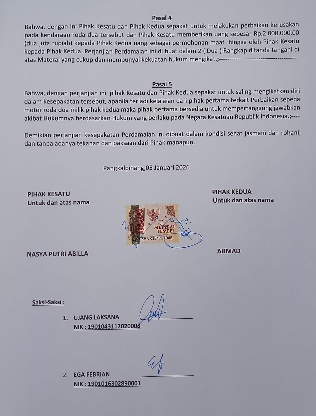 Dokumen perdamaian tersebut turut ditandatangani oleh saksi-saksi serta dibubuhi materai, sehingga memiliki kekuatan hukum mengikat. Dengan ditandatanganinya kesepakatan ini, proses hukum dinyatakan selesai dan tidak dilanjutkan ke tahap berikutnya.